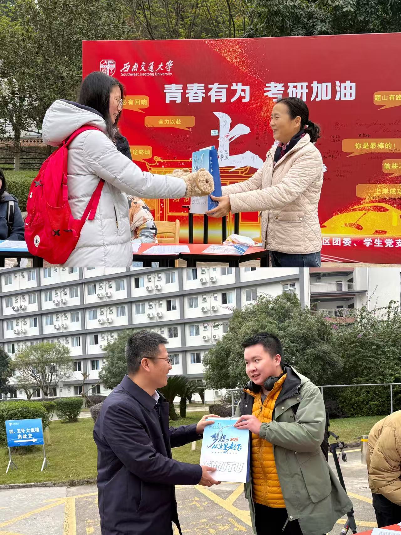 峨眉校区管委会常务副主任刘朝晖、副主任陈洪章来到活动现场,与备战考研的同学们亲切交流,关心询问他们的备考情况与生活状况,并送上精心准备的考研祝福礼包。刘朝晖勉励同学们保持良好心态,科学规划复习,注意劳逸结合。她表示,校区将一如既往关注同学们的需求,全力做好各项后勤保障与服务支持工作。