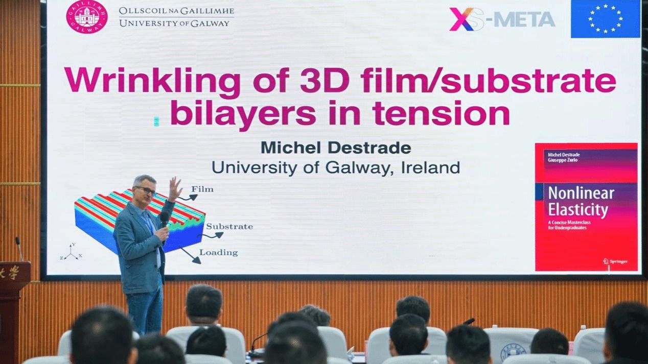 与会专家学者围绕力学领域前沿方向展开深入交流。燕山大学文桂林教授作了题为“倾转旋翼无人机设计思想与变构过程力学分析”的报告,爱尔兰高威大学Michel Destrade教授分享了薄膜/基底双层结构拉伸起皱失稳的相关研究。此外,天津大学王世斌教授、北京交通大学陈阿丽教授、华中科技大学彭泽瑞教授、西南交通大学陈开卷教授等分别就基础力学研究性教学、声学超表面波前调控、仿生柔性结构流固耦合动力学、拉胀结构逆向设计等课题作学术汇报。