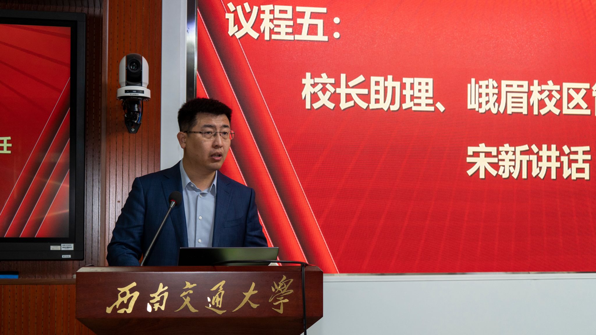 校长助理、峨眉校区管委会主任宋新代表校区向大会的召开表示祝贺,并向全体教职工的辛勤付出致以诚挚感谢。他充分肯定了过去一年校区在人才培养、教育培训、产教融合等方面取得的扎实成效,强调2026年既是“十五五”规划的开局之年,也是校区提质增效的关键节点,同时学校将迎来130周年华诞。面向新阶段,他提出三点期望:一是坚持思想领航,把牢政治方向;二是发扬民主,凝心聚力;三是聚焦核心任务,激发发展动能。最后,他号召全体教职工以共识凝聚合力,以实干书写答卷,同心同向、奋楫前行,共同开拓校区事业发展新局面。