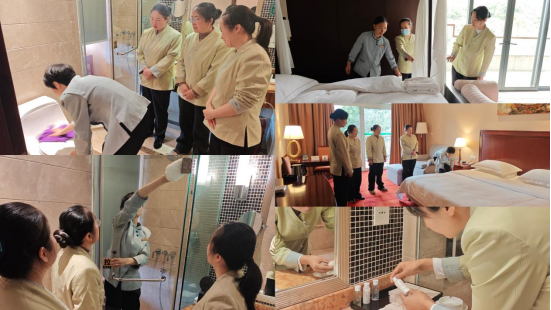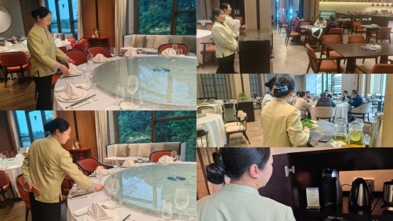 学习期间,团队成员分别在客房、餐厅岗位进行实操学习。客房板块重点学习客房服务规范、清洁标准及物品摆放技巧;餐厅板块围绕餐桌礼仪、上菜流程等内容精进业务。大家认真观摩、主动实践,将先进服务理念与操作技能学深悟透。