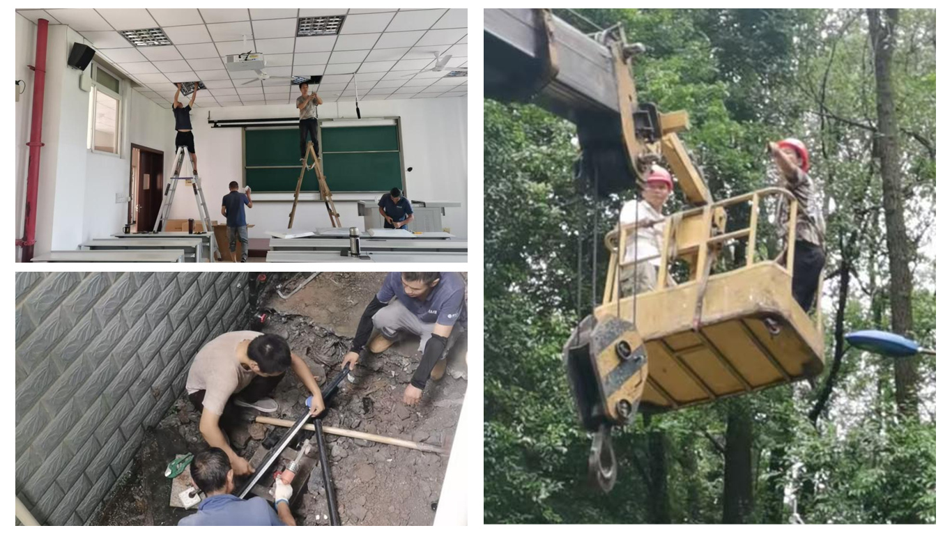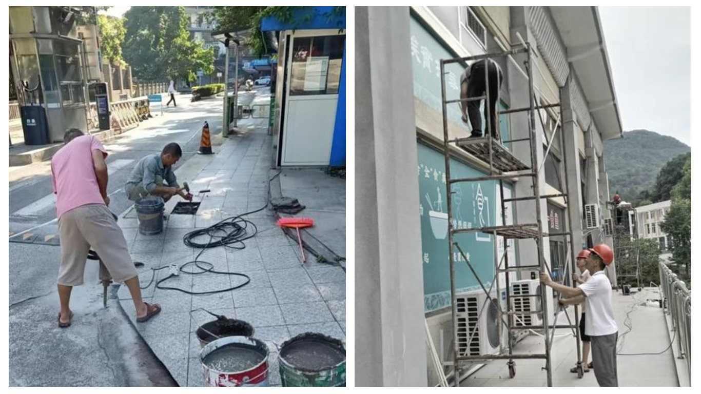 暑期维修攻坚行动 水电维修工作人员利用暑假黄金期,全面推进水电基础设施的排查与焕新工程,更换教学楼及公共区域损坏灯具、对供水管道进行排查、探漏、开挖抢修、墙面地面修复、供电隐患线路检修等工作。